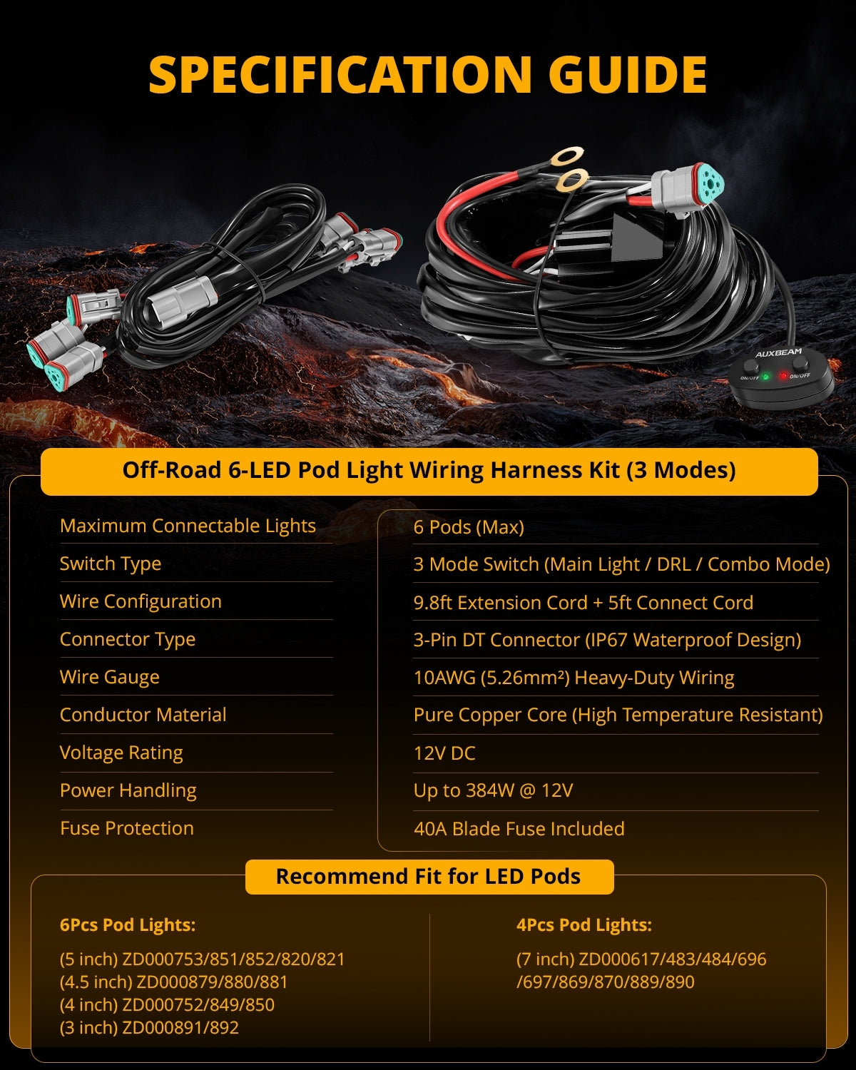 Compatible: The wiring harness of the LED Pod Light is suitable for three-wire Main Light+DRL mode, and also includes the 6 in 1 3PIN DT Plug, 40A fuse and relays. Built-in blade fuse to prevent overcurrent and short circuit to ensure the safety of the vehicle electrical system.