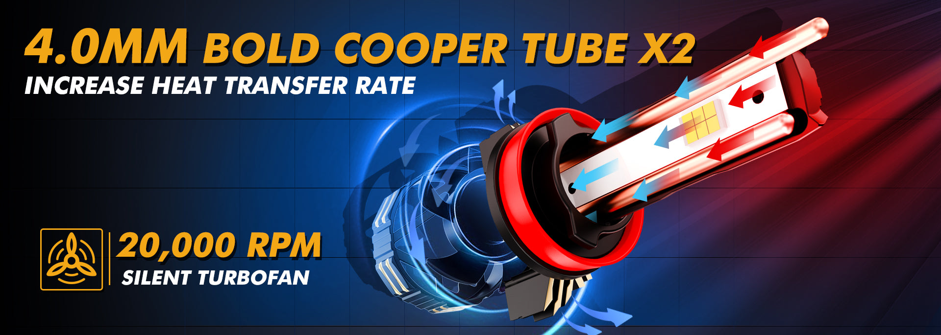 - The lights are equipped with an all-in-one aluminum material + a bold 4.0mm dual copper tube + a powerful 20,000 RPM super-speed cooling fan that directly improves 4X heat conduction speed.